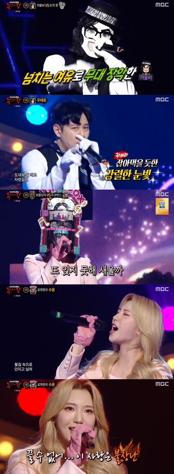 '복면가왕' 1라운드에서 윤택, 황재균, 우태운, 로켓펀치 수윤의 정체가 공개됐다. 또한 가왕의 자리를 위협하는 '보물상자'가 등장했다.