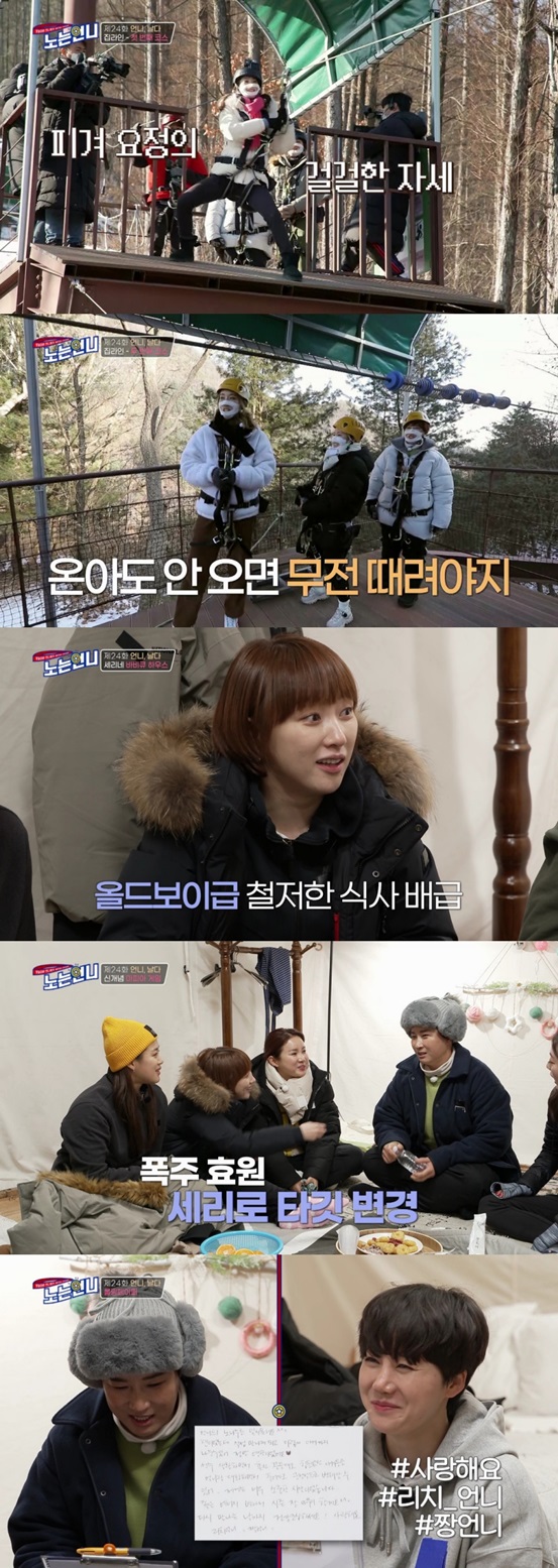 지난 12일 방송 된 티캐스트 E채널 '노는 언니'에서 언니들은 겨울에 즐겨서 더욱 매력적인 집라인과 글램핑에 도전했다. 집라인을 타야만 볼 수 있는 풍경과 밤에 더 운치 있었던 글램핑에 언니들은 눈과 입이 즐거운 시간을 보냈다.