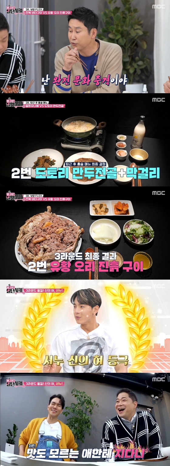 '일단 시켜' 가수 셔누가 전반전에서 우승했다. '배린이' 신동엽은 집으로 배달 음식을 시켰다.