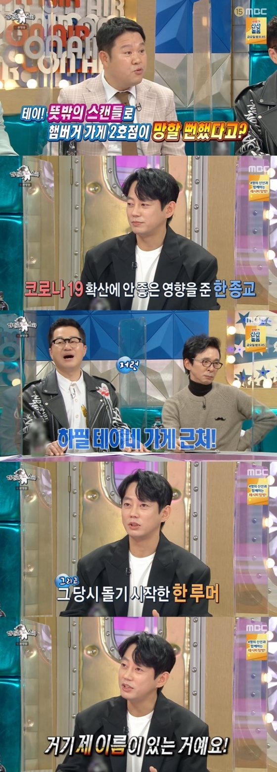 MC 김구라는 "뜻밖의 스캔들로 햄버거 가게 2호점이 망할 뻔했다고?"라고 물었다. 이에 테이는 "코로나19 확산에 안 좋은 영향을 준 종교가 있는데 하필 제가 햄버거 가게 2호점을 낸 근처에서 모임을 했다더라"라며 말을 꺼냈다.