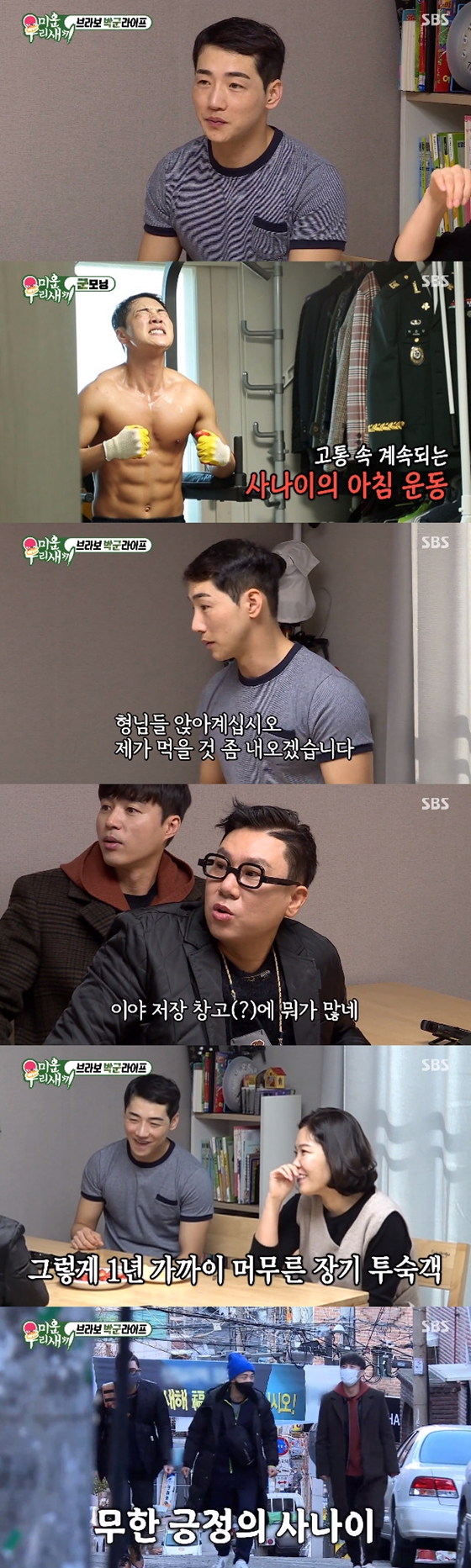 박군은 기상하자마자 이불 정리에 나섰다. 각 잡힌 이불 정리에 이어 노래 '빈대떡 신사'를 들으며 팔굽혀펴기를 했다. 또 철봉 운동 등 전역 후에도 꾸준히 운동을 하는 모습을 보여줬다. 상의 탈의까지 하고 운동하는 박군은 근육질 몸매를 뽐내 눈길을 끌었다.