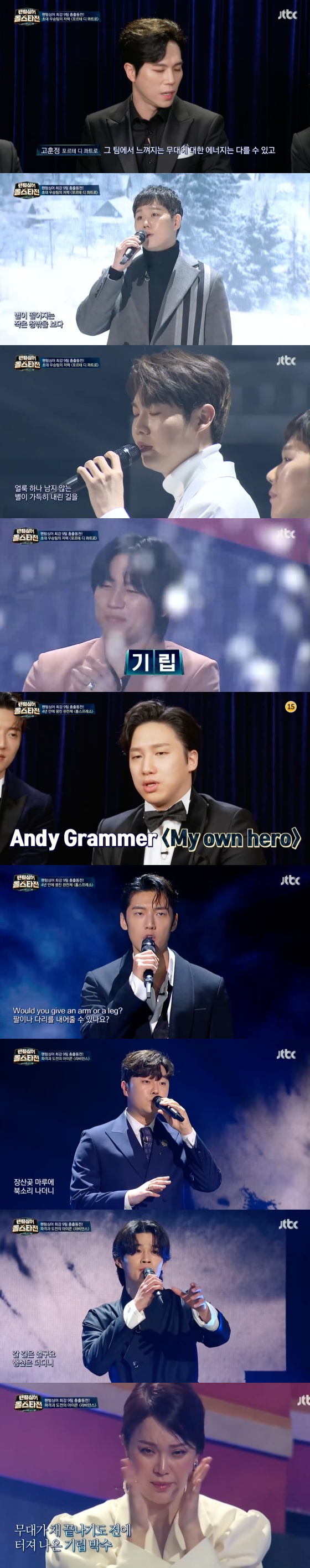 26일 오후 방송된 JTBC 음악 예능프로그램 '팬텀싱어 올스타전'에는 포르테 디 콰트로, 흉스프레소, 포레스텔라, 미라클라스, 에델라인클랑, 라포엠, 라비던스, 레떼아모르 등 역대 팬텀싱어 1위, 2위, 3위 팀이 모여 왕중왕전을 펼치는 장면이 담겼다.