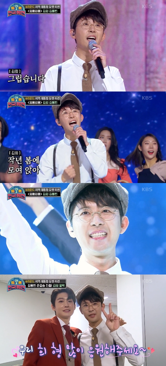 이후 4라운드 지역 대통합 듀엣 미션에서 김용빈과 백난아의 '찔레꽃'을 선곡해 무대에 섰다. '희용희용' 팀으로 김용빈과 무대를 꾸민 김희는 환상적인 호흡을 보여줬다.