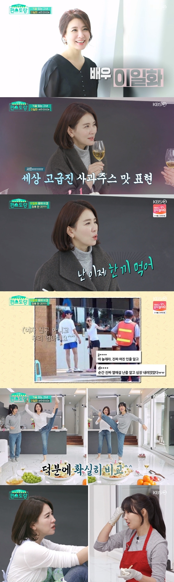 이와 함께 이일화는 이유리가 "선배님 어록 있잖아요. 김사랑 언니가 '세 끼 먹으면 살쪄요' 했잖아요. 선배님(이일화)한테 물어봤더니 '두 끼 먹으면 살쪄'라고 하셔서"라고 말하자, "나 이제 한 끼 먹어"라고 밝혀 놀라움을 자아냈다. 이일화는 올해 한국 나이로 51세. 50대 나이가 믿기지 않을 만큼 군살 없는 몸매를 '편스토랑'을 통해 공개해 눈길을 사로잡았다.