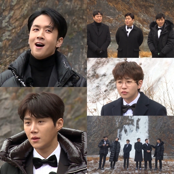 여기에 제작진이 빙벽 등반용 아이젠까지 나눠주자, 경악하며 갖가지 반응을 터뜨린다. 연정훈은 “무슨 턱시도를 입고 이런 데를 와요?”라며 항의하는가 하면, 딘딘은 “무슨 영화로 포스터를 찍길래...”라며 긴장한 기색을 감추지 못한다.