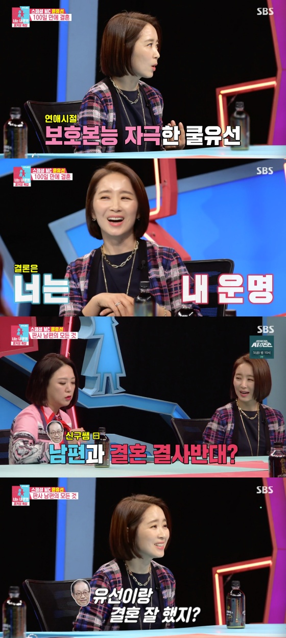 이날 윤유선은 만난 지 일주일 만에 프러포즈 받은 후 100일 만에 결혼했다고 밝혔다. 윤유선은 "남편이 '넌 내가 딱이야. 결혼하자'라고 했다. 그래서 '내가 엄청 좋은가보다' 했는데 알고 보니까 내가 까다롭기도 하고 허당 같기도 해서 자기밖에 없다고 하더라"라고 말했다.