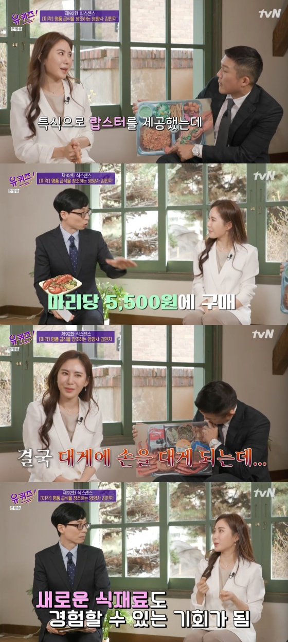 이날 조세호는 온라인상에서 화제가 됐던 '1인 1랍스터' 급식 사진을 꺼냈다. 김민지는 "이벤트성으로 랍스터를 제공했는데 반응이 좋아서 이후에도 계속 했다"며 "보통 인터넷에서 랍스터가 만 원에서 이 만원 정도 하는데 수산시장을 찾아 저렴한 업체를 찾았고, 한 마리당 5500원 정도에 공급했다"고 설명했다.