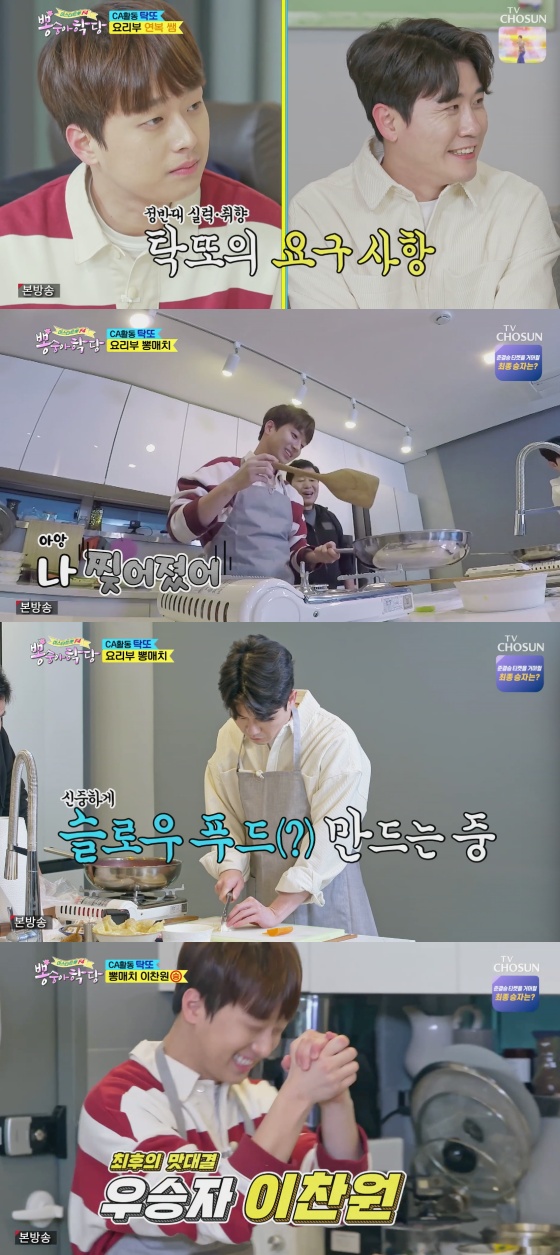 두 번째는 채소 썰기였다. 이찬원은 빠르게 채소를 썰었고, 느리게 채소를 썰던 영탁은 "천천히 하세요. 소리 시끄러워요"라고 경계했다. 이찬원은 "한숨 자고 올게요"라며 영탁을 도발했다. 1대 1 상황에 놓인 두 사람이었다.