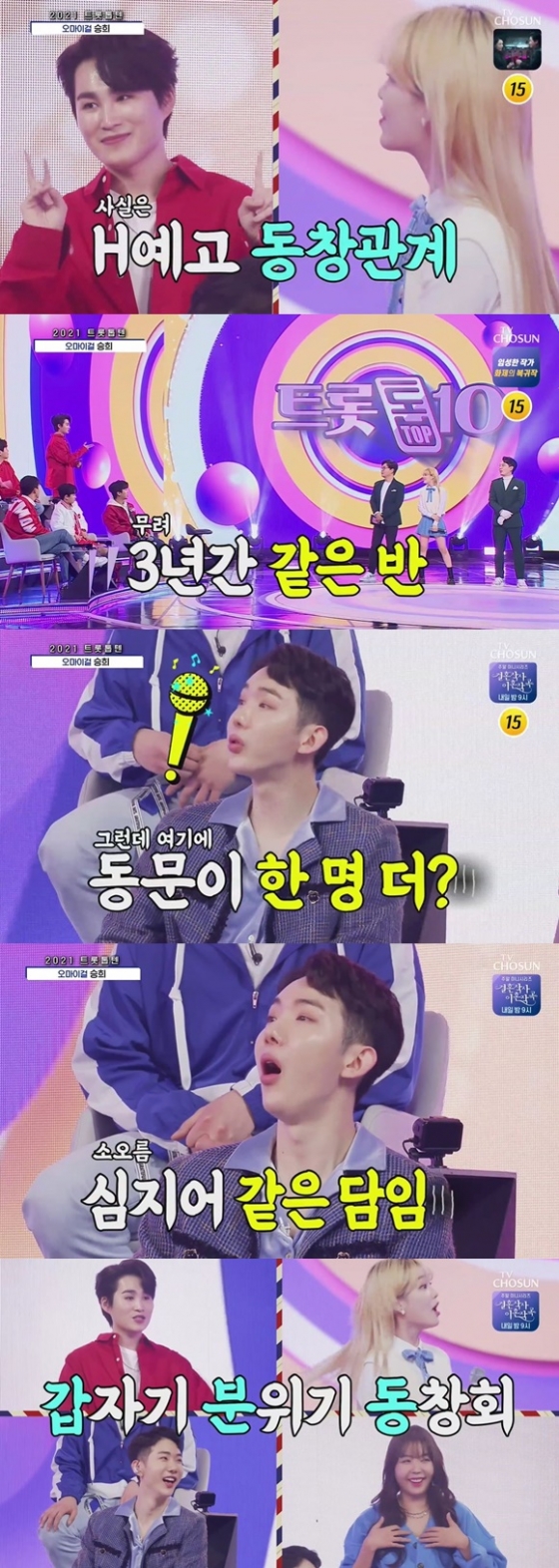 승희는 "고등학교 동창이에요"라며 구면임을 밝혔다. 김희재는 "3년을 같은 반이었어요"라고 말해 놀라움을 자아냈다. 이어 김희재는 "여기 계신 조권 선배님도 같은 학교 나오셨어요. 저희 담임 선생님이 다 같았어요"라고 말했다.