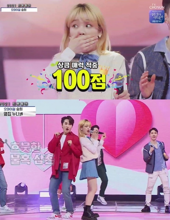 이날 오마이걸 승희는 이찬원의 '여여'에 대항해 장윤정의 '옆집 누나'로 대결을 펼쳤다. 신나는 템포의 음악에 맞춰 춤을 추던 승희는 갑자기 김희재를 무대로 불러 함께 커플 댄스를 추었고 MC들 및 TOP6들은 크게 놀랐다.