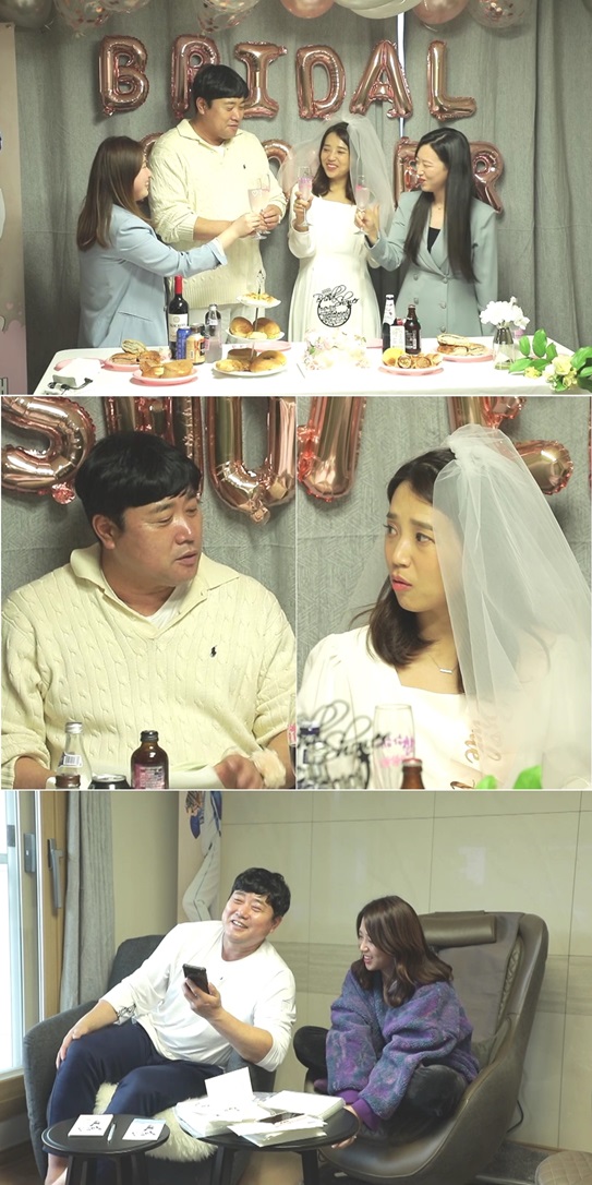 신혼 살림을 둘러보며 수다를 떨던 친구들은 이내 양준혁과 의미심장한 눈빛을 주고받더니 미리 준비한 드레스를 박현선에게 건넸다. 바로 양준혁과 박현선의 친구들이 깜짝 브라이덜 샤워를 계획했던 것.