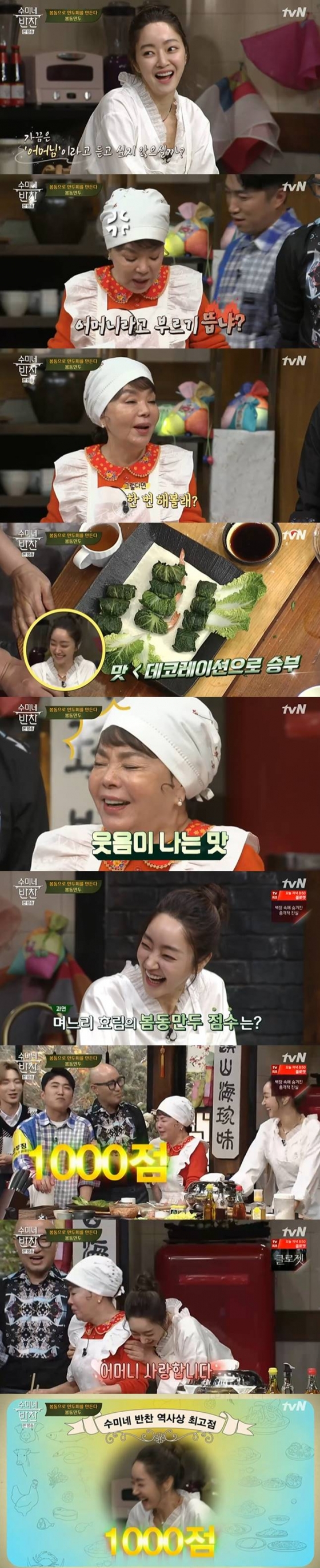김수미는 서효림이 만든 봄동만두를 보고 "예쁘게 쌌다"고 기대감을 보였다. 김수미는 서효림표 봄동만두 맛을 보고는 "1000점"이라고 폭주해 폭소를 자아냈다. 그는 서효림에게 "역대급! '수미네 반찬' 나와서 1000점 맞은 건 너 하나야"라고 극찬했다.