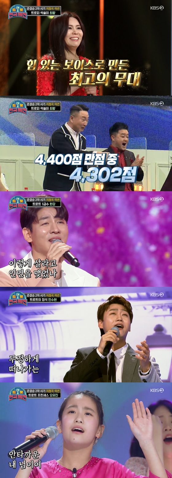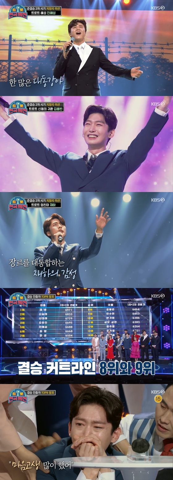 만능 싱어송트로터 김윤길은 '싫다 싫어'로 극찬을 받았음에도 10위에 올라 아쉬움을 안겼다. 우승 후보 진해성은 '한 많은 대동강'으로 무대를 꾸몄다. 이에 홍경민은 "초대가수 같았다. 자기 노래처럼 자연스러워서 좋은 점수가 안 나올 수 없지 않나"라고 호평을 전했다. 진해성은 자신의 팬 오유진의 것과 같은 4188점을 기록해 놀라움을 자아냈다.