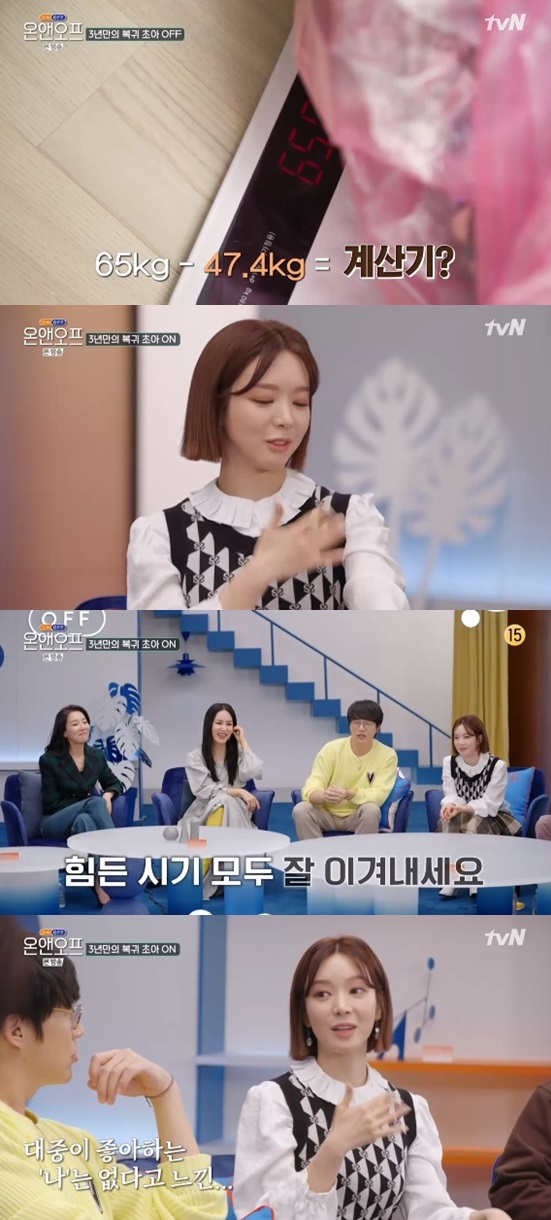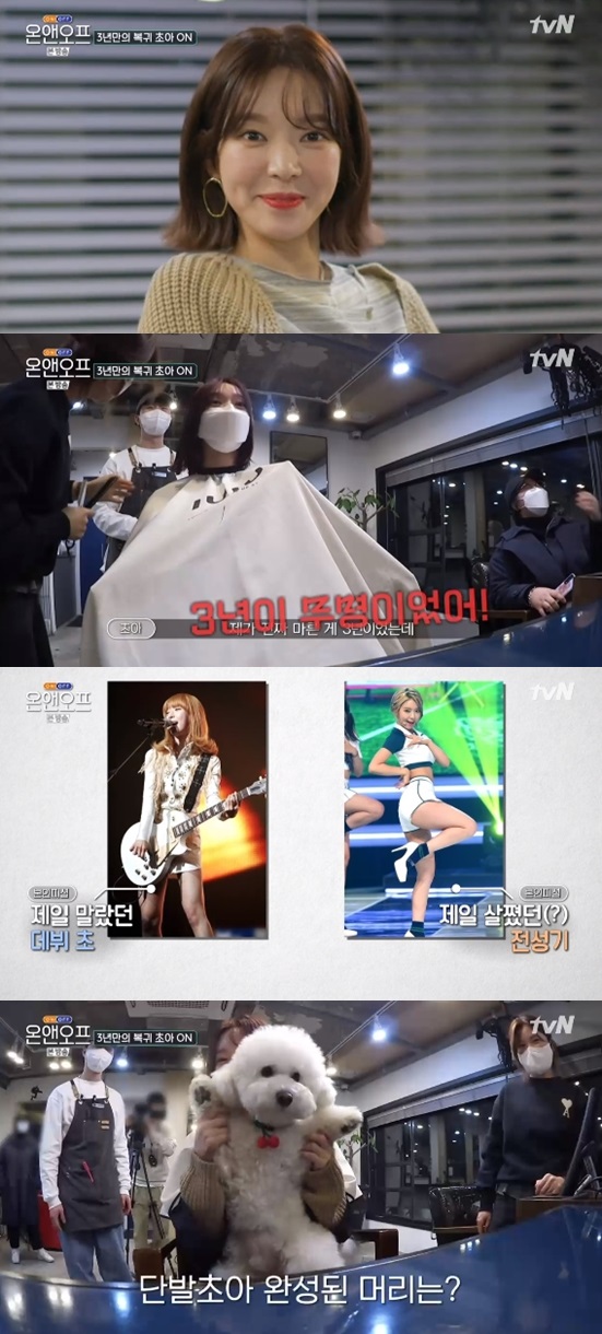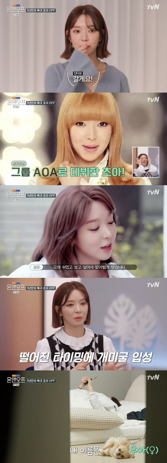 초아는 16일 방송된 tvN '온앤오프'를 통해 3년 만에 방송에 복귀했다.