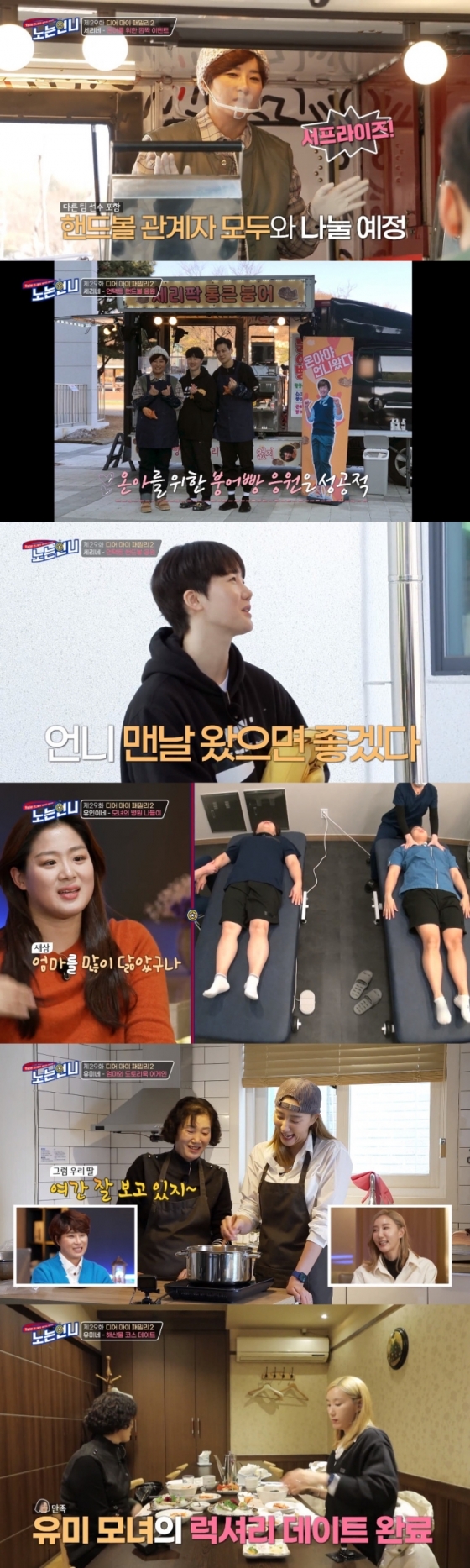 한편, 한유미와 정유인은 엄마와의 데이트를 즐겼다. 두 사람 모두 엄마와 붕어빵처럼 닮아 언니들을 놀라게 했음은 물론 뜻밖의 효녀 모먼트와 엄마들의 예능감을 볼 수 있어 더욱 색달랐다. 어린 시절부터 가게 일을 도왔던 정유인은 능숙하게 엄마와 함께 도시락을 만들며 군침을 자극했다. 또 아픈 몸을 이끌고 오랜 시간 자신을 뒷바라지 해준 엄마를 위해 커플 도수 치료를 준비해 가슴을 온기로 물들였다.
