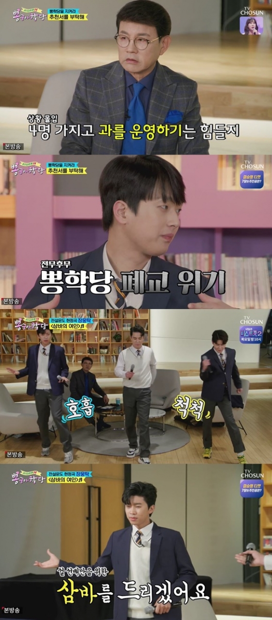 이날 임영웅과 장민호, 영탁은 설운도를 만나 "뽕학당이 폐교될 위기에 처했다. 폐교 당하지 않기 위해 추천서를 써달라"고 부탁했다.