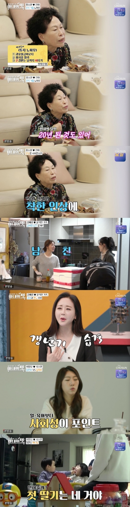 23일 오후 방송된 TV조선 예능 프로그램 '세상 어디에도 없는, 아내의 맛'에는 함소원-진화 부부가 전원주를 초대해 살림 이야기를 듣는 장면이 담겼다.