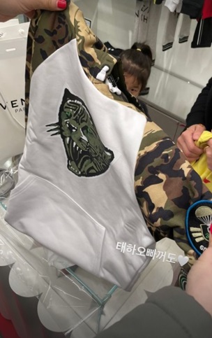딸이 한 명품 브랜드 재킷을 입어보고 있는 사진 위에는 "엄마가 많이 부러웠나 봐"라고 썼다. 또 아들 옷을 고르는 사진도 함께 공개하며 "태하 오빠 것도"라고 전했다.