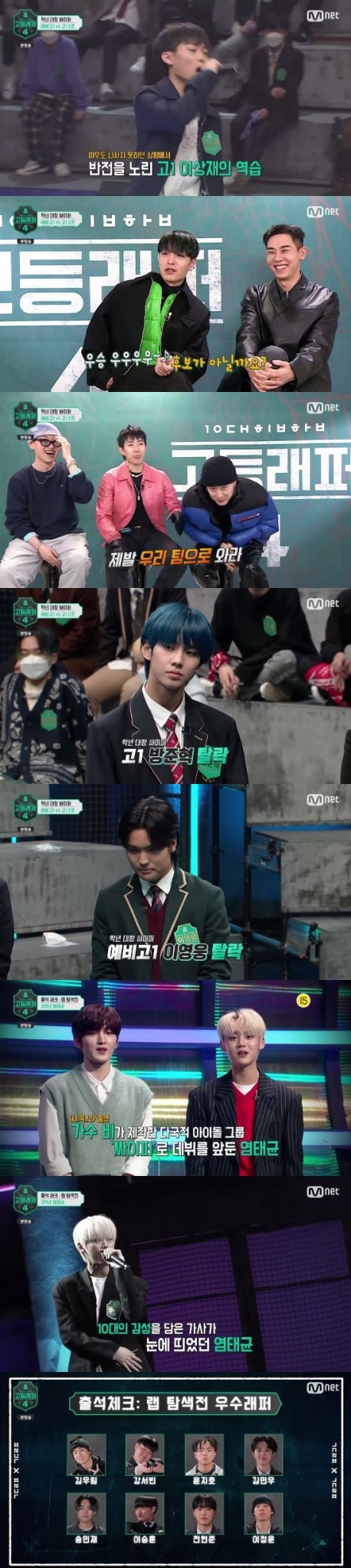 26일 오후 방송된 Mnet 음악 예능프로그램 '고등래퍼4'에는 학년 대항 싸이퍼 무대와 함께 첫 탈락자가 공개됐다.