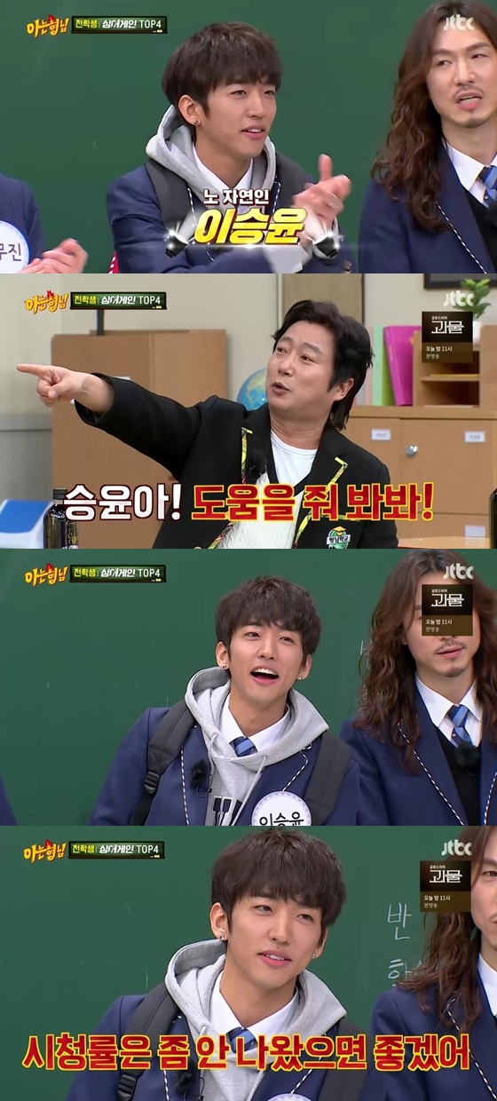 그러자 이수근은 "승윤아 도움을 줘봐봐"라고 '싱어게인' 우승자 이승윤에게 도움을 청했다. 이승윤은 "나는 시즌2가 나와도 되는데 시청률은 안 나왔으면 좋겠어"라고 말해 웃음을 안겼다.