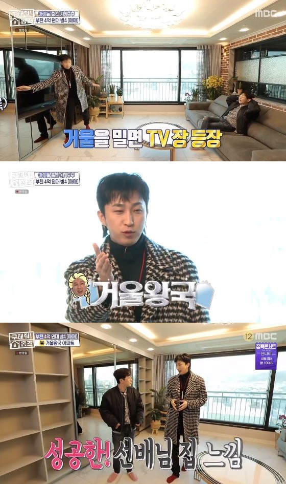 이들이 향한 곳은 부천시 신곡동의 나홀로 아파트였다. 현관에서부터 세련된 스타일이 돋보이는 이 집은 화려한 골드 톤과 디테일이 돋보였다. 두 사람이 소개한 '거울왕국'은 집안 곳곳에 거울들이 배치됐고, 화려한 인테리어가 돋보이며 '연예인을 위한 맞춤형 집'으로 평가받았다.