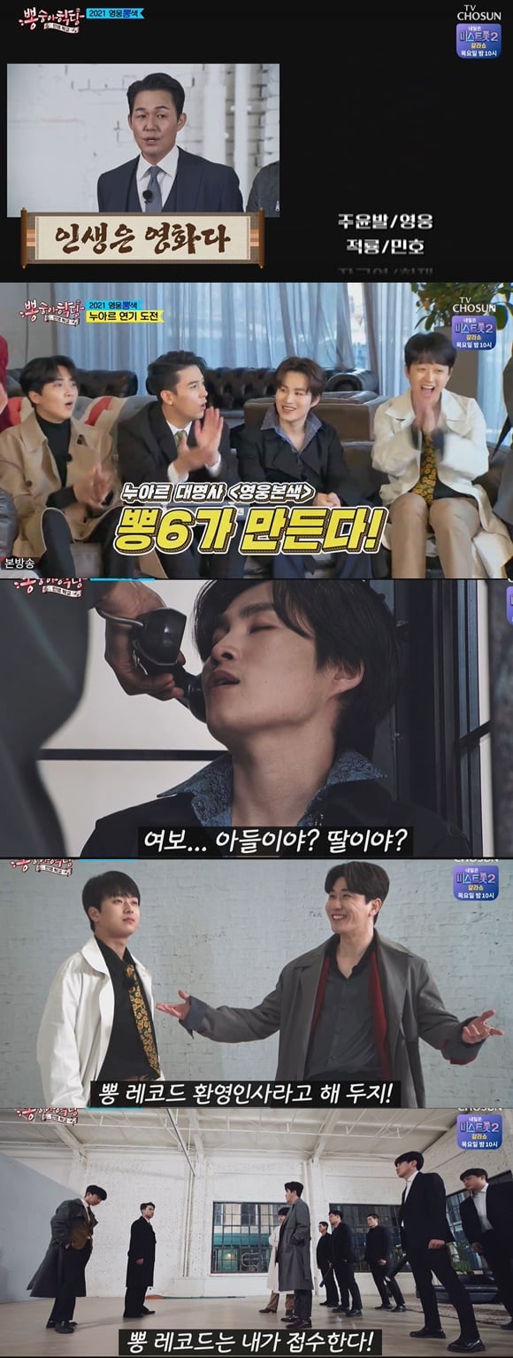 10일 오후 방송된 TV조선 예능프로그램 '뽕숭아학당 - 인생학교'에서는 박성웅이 뽕6(임영웅, 이찬원, 김희재, 황윤성, 영탁, 장민호)의 연기 선생님으로 등장했다.