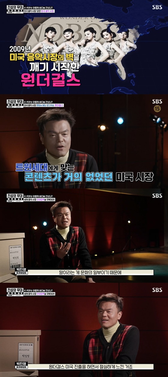 14일 오후 방송된 SBS '전설의 무대-아카이브K'에서는 '바다를 건넌 K-Pop'이라는 주제로 K팝의 역사에 대해 다룬 가운데, 박진영이 원더걸스의 미국 진출기를 전했다.