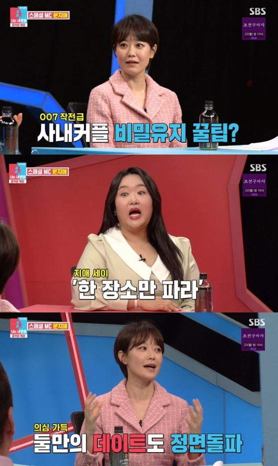 이어 MC 김숙은 "비밀 연애를 4년 동안 하는 게 쉽지 않았을 텐데, 팁을 좀 알려달라"고 요청했다. 이에 문지애는 "일단은 여러 군데를 돌아다니지 말아라. 우리는 딱 두 군데서만 데이트를 했었다. 단, 사람들이 많은 장소에서는 오히려 카페 중앙에 자리를 잡고 직장 동료임을 어필하라"고 언급했다.