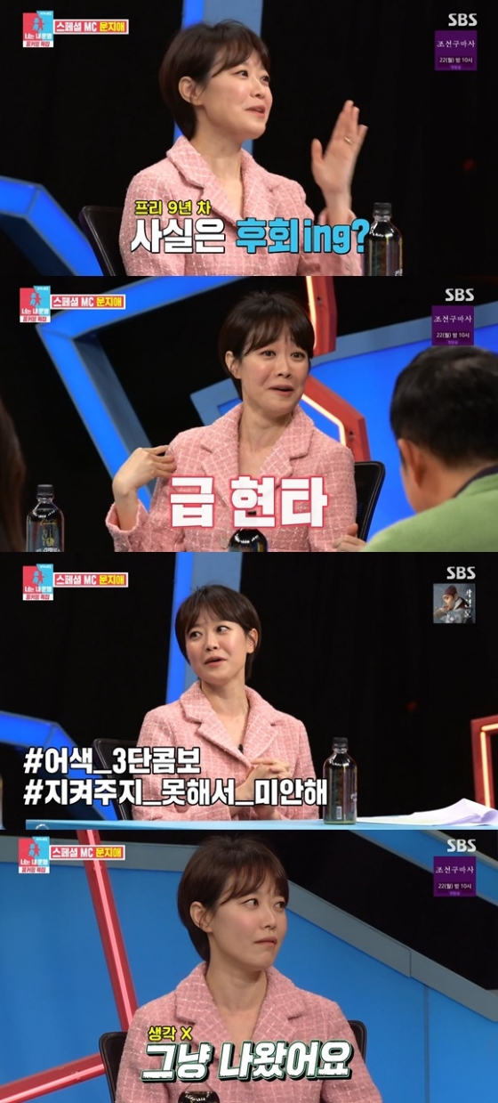 그러나 문지애는 "우리는 비밀인 줄 알았는데 이미 주변에서는 다 알고 있더라"고 말해 웃음을 자아냈다. 이어 문지애는 프리랜서 선언 9년 차로 "프리랜서 생활이 맞지 않는다"고 밝혔다.