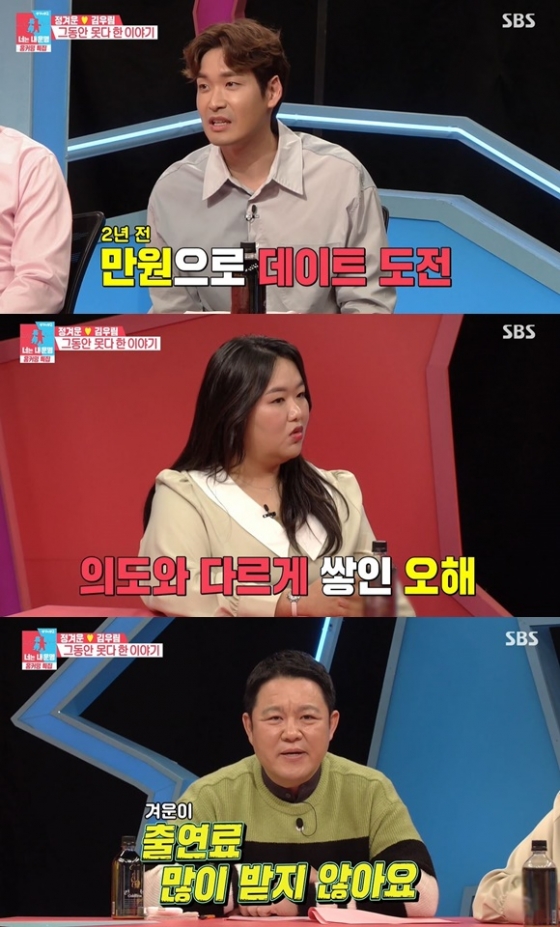 이어 "2년 전 '만원의 행복'으로 데이트를 했었다. 그걸 하면서 악플에 많이 시달려서 힘들었다. 우리는 그렇게 하루를 살아보자며 좋은 취지로 시작했는데 오해하시는 분들이 많았다. 저희는 그렇게 어마어마한 출연료를 받은 적이 없다"고 털어놨다.