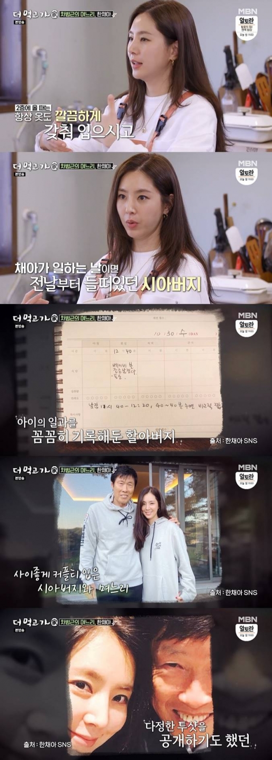 시아버지 차범근의 모습으로 한채아는 "아버님이 아이를 안을 때도 새 옷으로 갈아입고 왔다. 출산 후 8개월 때부터 내가 일을 했는데, (차범근이) 그때부터 들떠했다. 봄이(아이)와 둘이 있으니까"라며 "갔다 오면 몇 시에 뭘 먹었고 잤는지 다 적어놓으셨다. 우유도 정확히 타서 줬다"고 전했다.