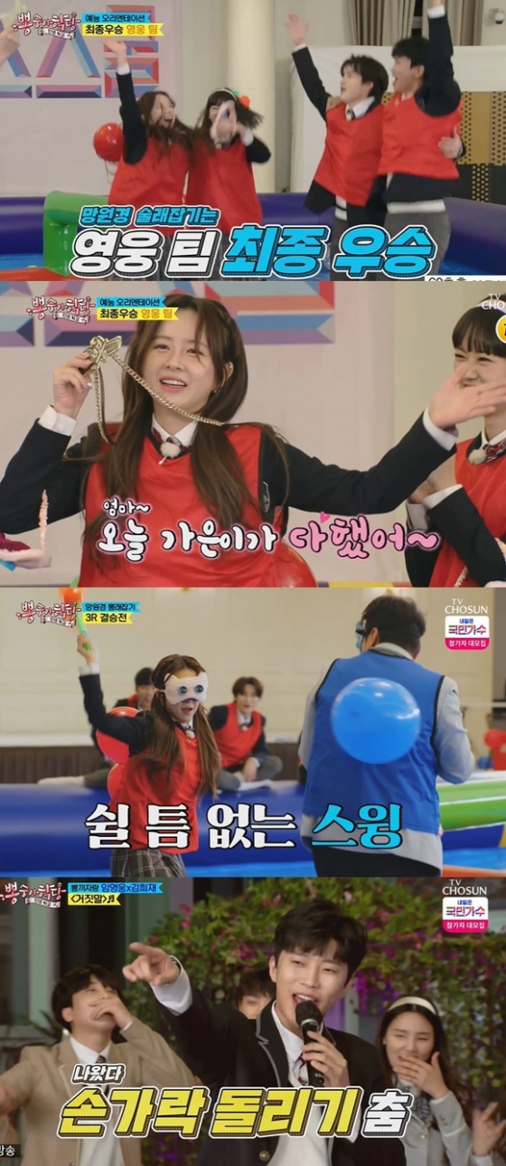 이후 특급 예능 수업의 마지막 교시 '망원경 술래잡기'가 시작됐고, 이전보다 한 단계 업그레이드된 망원경 게임의 등장에 모두가 집중력을 발휘했다. 마지막까지 살아남은 장민호와 은가은이 불굴의 투혼을 보였고 결국 은가은의 맹활약으로 영웅 팀이 승리하며 금 마이크 상금의 주인공이 됐다.