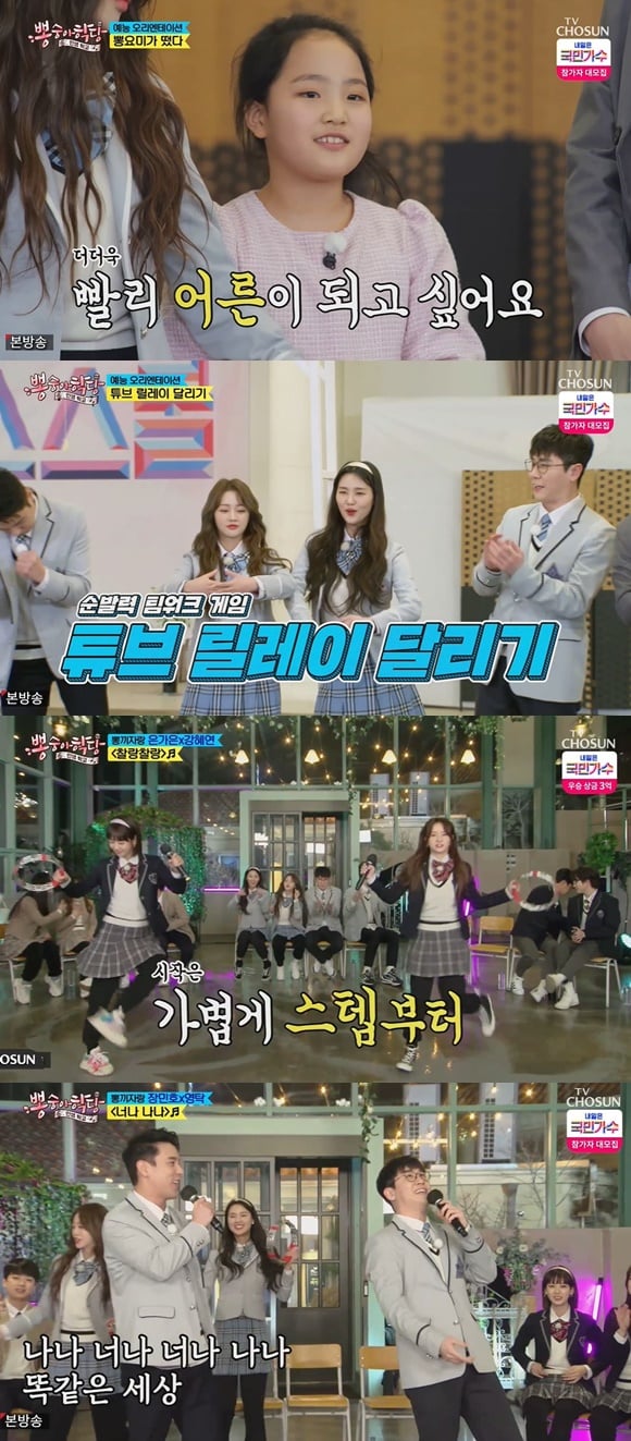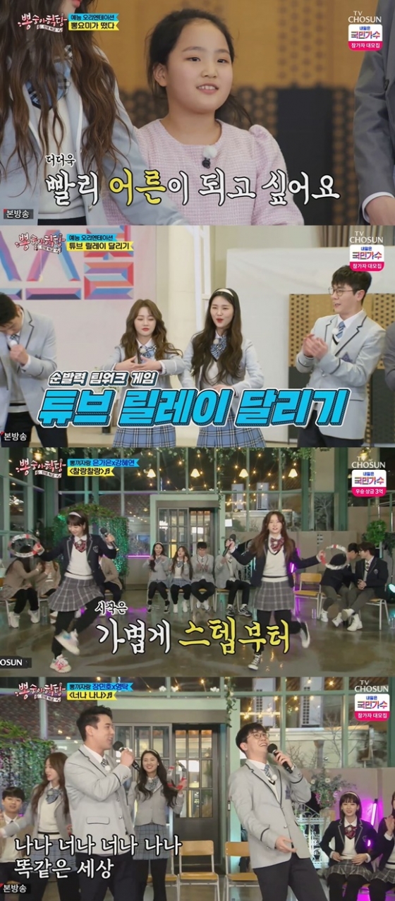 예능 오리엔테이션이 끝나고 본 게임 공포의 지압판을 밟고 달리는'튜브 릴레이'에서는 민호 팀이 1위를 차지했다. 이어 '뽕기자랑'에서는 듀엣으로 노래 대결을 펼쳤다. 선배, 후배 팀 각 1등을 뽑아서 바람 마이크로 승패 팀을 공개했다.