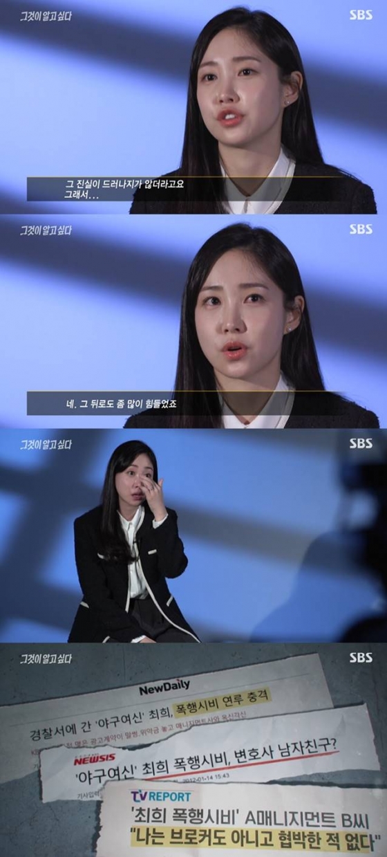 최희는 "기사가 나고 검색어 1위에 올랐는데도 수많은 질타를 받았다. 반박 기사를 내고 정정보도를 내고 인터뷰를 수없이 했지만 진실이 드러나지 않았다. 그 뒤로도 많이 힘들었다"며 눈물을 보였다.