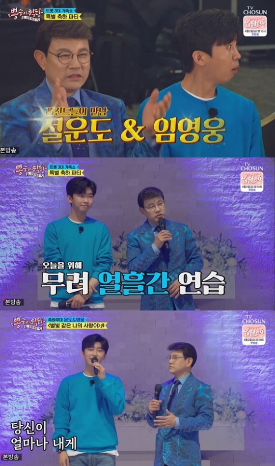 이날 방송에서 설운도와 임영웅이 임영웅의 신곡 '별빛 같은 나의 사랑아' 컬래버 무대를 함께 했다. 설운도는 "저희가 이 무대를 위해 열흘간 같이 연습했다"고 밝혔다.
