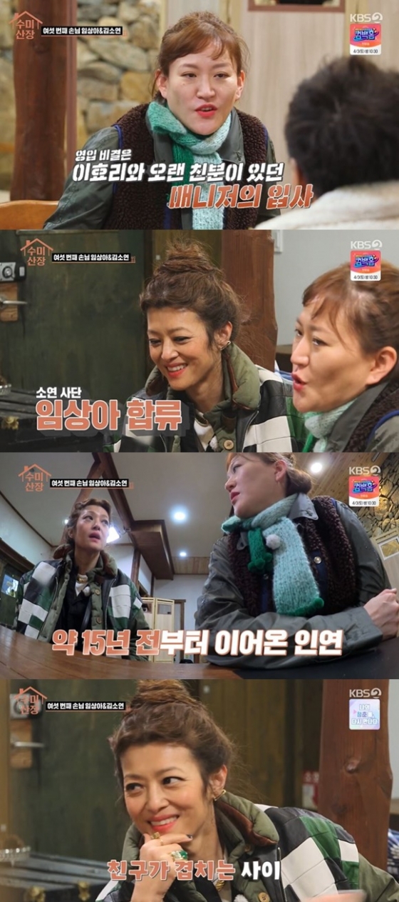 1일 오후 방송된 KBS 2TV, SKY 예능프로그램 '수미산장'에서는 연예기획사 대표 김소연과 패션디자이너 임상아가 함께 게스트로 출연했다.