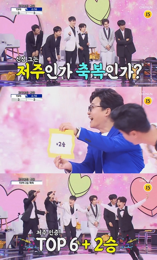 최종 승리팀은 다름 아닌 신성의 손에 결정됐다. MC 김성주가 신성의 저주를 확인하기 위해 신성에게 직접 럭키박스를 뽑아달라고 제안한 것. 임영웅은 "신성의 존재가 계속 저희 팀에 득이 되고 있다"며 톱6 대신 럭키박스 추첨을 맡겼다. 신성은 '톱6에게 2층 추가'를 뽑았고, 결국 5대 3으로 최종 승리는 톱6에게 돌아갔다. 황치열은 "1승도 아니고 2승"이라며 크게 웃었다. 신성도 허탈한 웃음을 지었다.