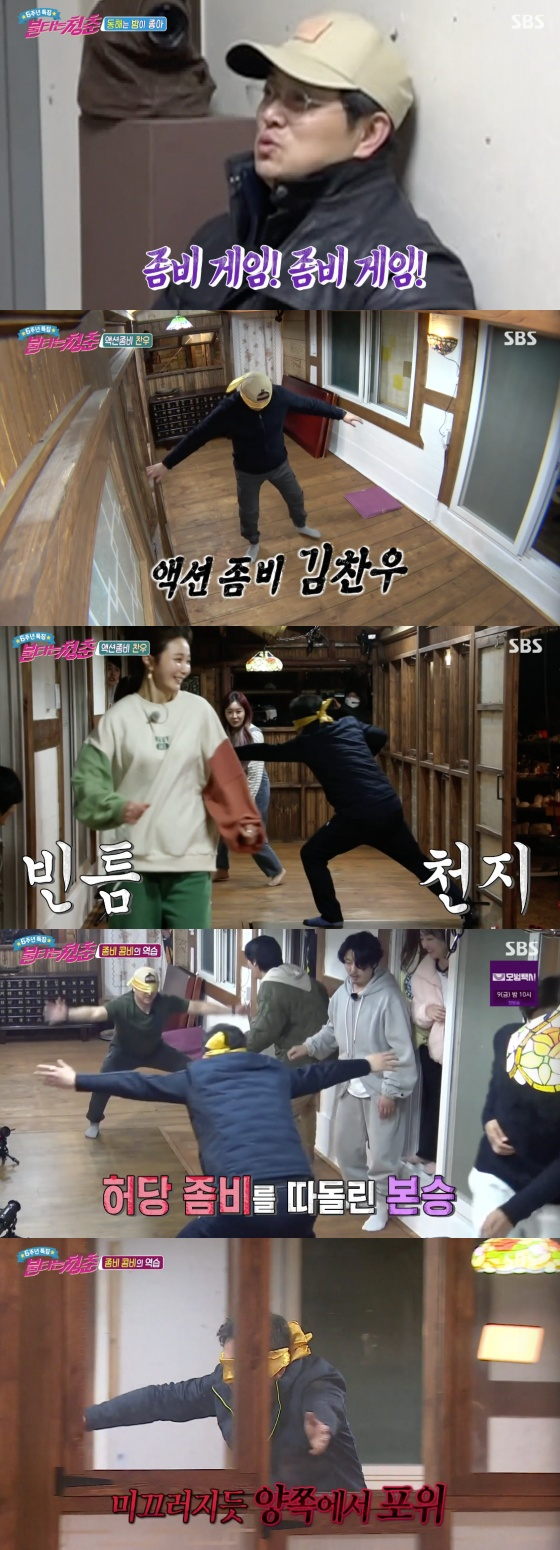 이날 김찬우는 일출을 건 좀비 게임을 제안했다. 좀비 게임이란 술래가 눈을 가리고 돌아다니는 사람들을 잡는 것이다. 과거 연기 생활 때 화려한 액션을 보여줬던 김찬우는 좀비 게임을 앞두고 자신감을 보였다. 김찬우는 "팔이 기니까 이렇게 (팔을 벌리고) 가면 (다 잡을 수 있다)"며 자세를 잡았다.
