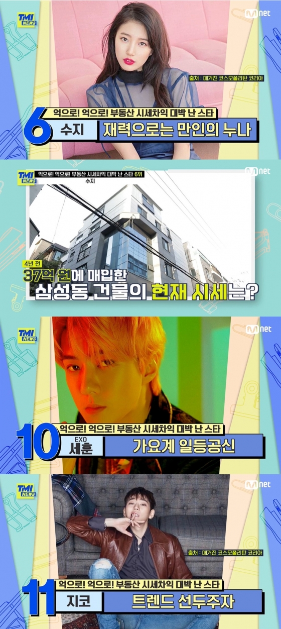 지난 7일 방송된 Mnet 예능프로그램 'TMI NEWS'에서는 연예인들의 부동산 시세차익을 공개했다.