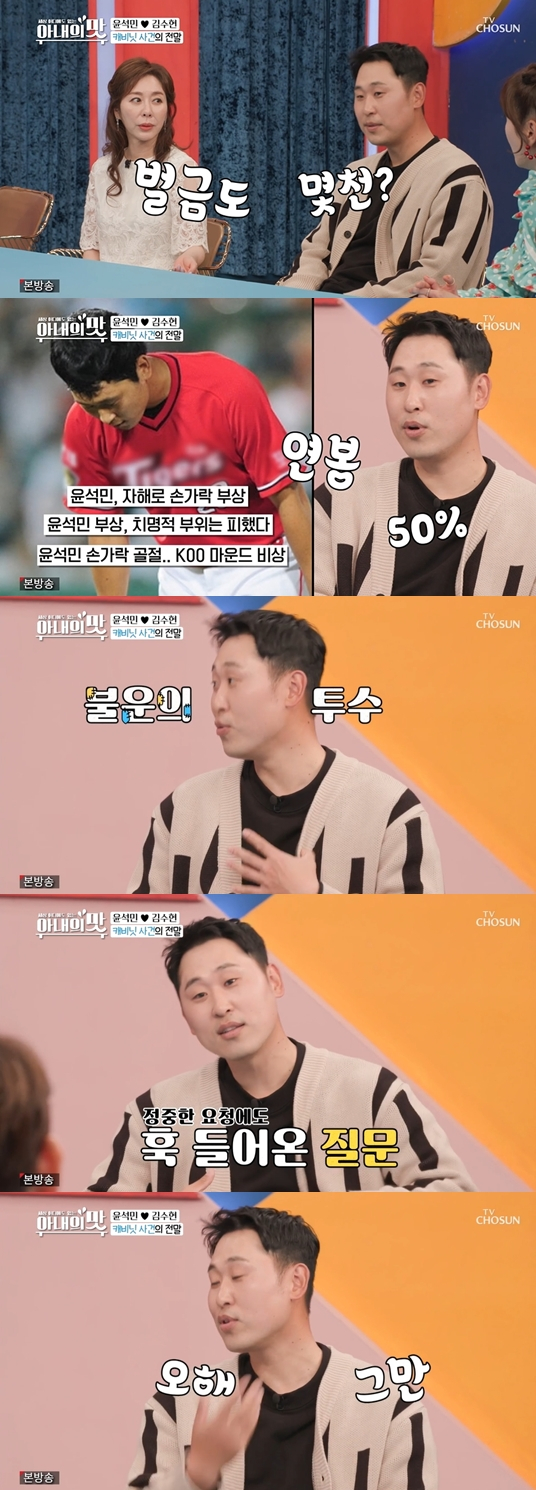 스튜디오에서 VCR로 이 모습을 지켜본 윤석민은 당시 일로 징계를 받았던 기억을 털어놓으며 "벌금을 3000만원 정도 냈다"며 "재활기간이 끝날 때까지 월급은 반으로 깎였다"고 말했다.