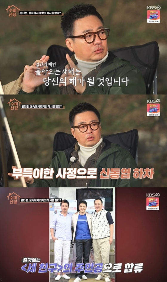 이어 윤다훈은 "'세 친구' 출연하기 전에 잠을 자다 꿈을 꿨는데 초췌한 걸인이 나보고 '돌아오는 새해는 당신의 해가 될 것입니다'라고 얘기를 하는 거다. 그리고 난 다음에 부득이한 사정으로 신동엽이 하차하면서 '세 친구' 주인공 자리에 내가 들어가게 됐다. 그 뒤로 1년에 40개가 넘는 CF를 찍으며 한국 기네스에도 올랐다"며 국민배우로 승승장구하게 된 스토리를 전해 놀라움을 자아냈다.