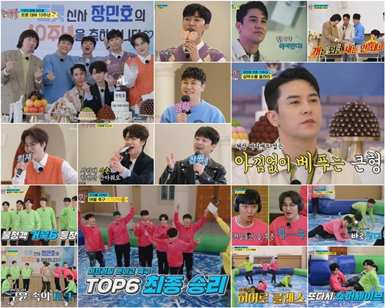 이후 장민호의 본격 10주년 기념파티에는 레전드 설운도, 장윤정부터 배우 박성웅, 신애라, 방송인 홍현희까지 지인들의 축하 영상편지가 쏟아졌다. 장민호는 "이런 날이 올 거라는 예상을 단 하루도 하면서 살지 못했던 거 같다"고 울컥하며 "저 친구들 없었으면 이런 기쁨을 또 누구랑 나눌 수 있을까. 너무 고맙다"라는 진심을 전했다. 다음으로는 TOP5가 장민호를 위한 헌정곡을 한 명씩 부른 후 장민호 심장박동수 총합이 450 이상이면, 선물 2개를 획득하는 미션이 진행됐다. 정동원은 장민호의 트롯 데뷔곡인 '사랑해 누나'를 '사랑해 삼촌'으로 개사, 장민호의 심장을 저격했지만 87점이라는 다소 아쉬운 심박수를 받았다. 이어 '세월아'를 열창한 김희재는 95점, 장민호의 '드라마'를 선곡한 이찬원은 101점을 기록했던 터. 임영웅은 동생들을 잘 챙겨주는 장민호에게 고마움을 표하면서 "이런 형이 있다는 게 자랑스럽다"고 곽진언의 '자랑'을 선사, 현장을 감동으로 물들였지만 86점에 그쳤다. 마지막으로 영탁은 장민호에게 애틋한 진심을 담아 노라조의 '형'을 선곡, 눈물샘을 자극했고 88점을 받았다. 결국 총합 457점으로 선물 2개를 얻었다.