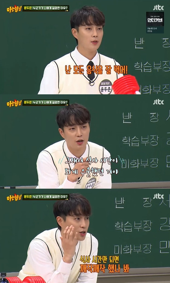 윤두준은 "훈련소에서 식사 시간이 우울해서 밥을 깨작깨작 먹었다. 200명 중 80명은 나를 쳐다보고 있었는데, 내가 먹는 걸 보고 많이 오해하더라"고 전했다.