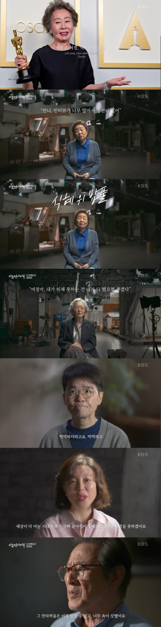29일 방송 된 KBS1TV에서 다큐인사이트 '다큐멘터리 윤여정'에서 한국 배우 최초로 오스카 트로피를 들어올린 윤여정의 연기인생을 돌아봤다. 윤여정의 작품은 물론, 그녀와 함께 한 11명 동료들의 이야기가 눈길을 사로잡았다.