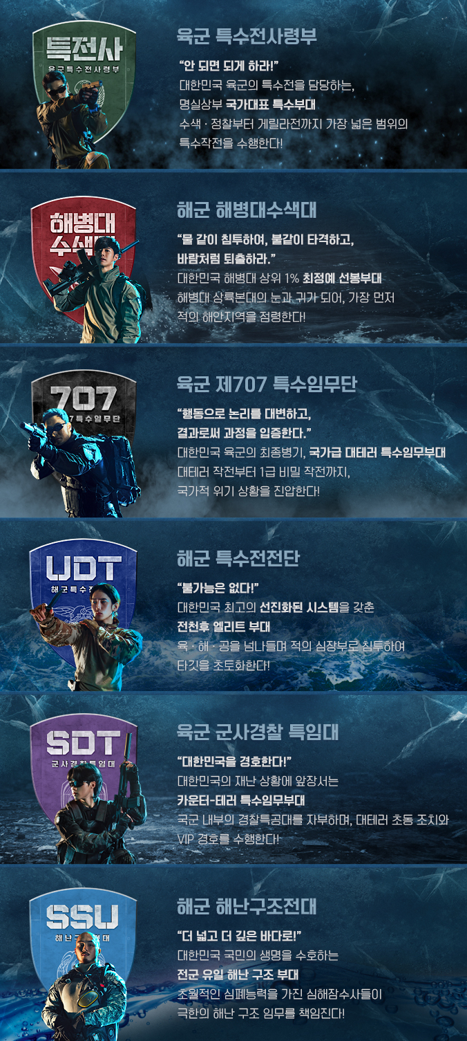 "목에서 피 맛이 난다"는 출연진의 말이 결코 농담은 아니다. 이들은 각 부대의 명예를 걸고 극한의 미션에 뛰어든다. 유도리란 없다. 정석의 미션 수행으로 매회 탈락팀을 가른다. 약체로 꼽혔던 707, SDT가 살아남고 예상밖에 오종혁 팀장의 해병대수색대가 이미 탈락했다. 부대 간의 살벌한 신경전, 멘탈과 체력 모두 요구하는 극한의 도전, 반전의 드라마, 전우애 등 리얼한 전개가 시청자를 절로 몰입케 만든다.