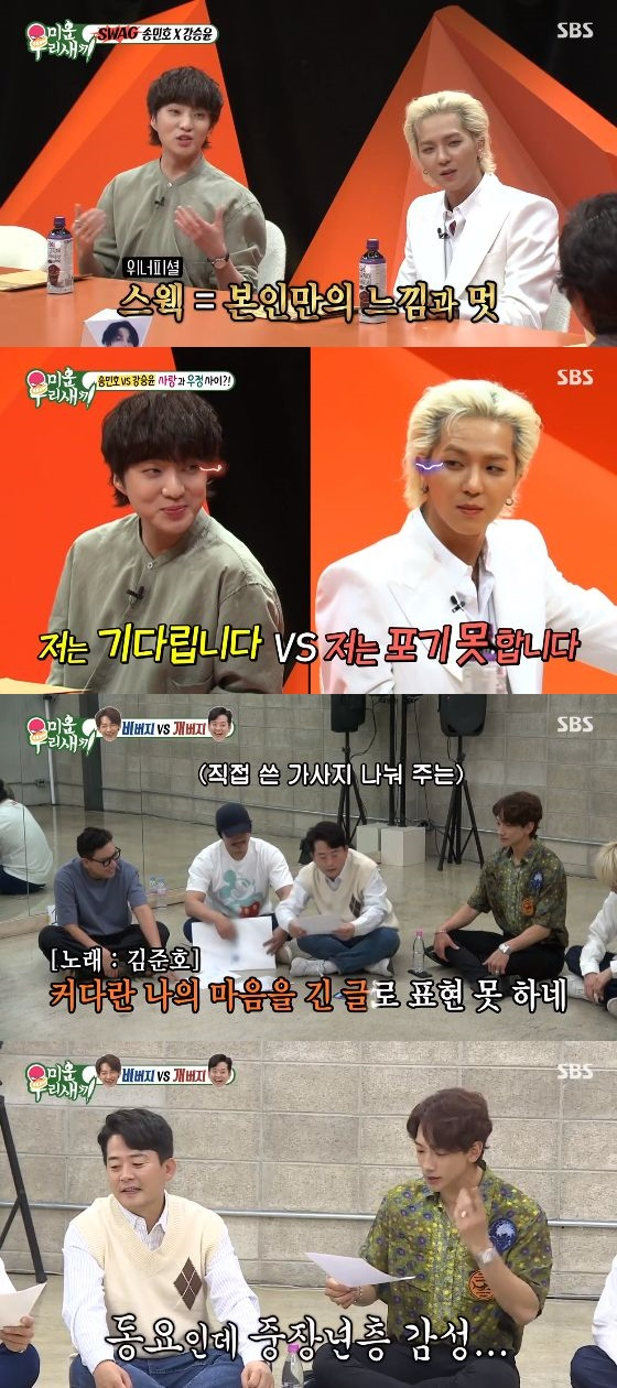신동엽은 "두 사람이 동시에 한 여자를 좋아하게 된다면 어떨 것 같냐"고 물었다. 이에 송민호는 "포기 못합니다"라고, 강승윤은 "저는 기다립니다"라고 서로 다른 대답을 했다. 강승윤은 "이런 상황에서 저는 기다리는 타입이다. 장기전으로 생각하는 편"이라고 덧붙였다.