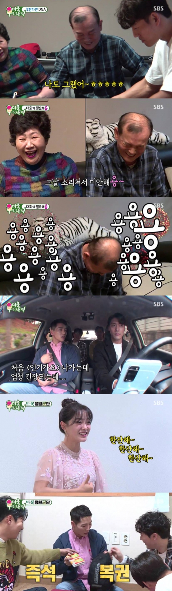이어 김종국은 부모님께 부부 싸움을 안하게 만드는 '꿀팁'으로 말끝에 'ㅇ'을 붙이는 걸 제안했다. 김종국의 아버지는 쑥쓰럽고 민망해서 계속 망설였다. 하지만 그는 어머니와 아들의 성화에 못이겨 결국 "그날 소리쳐서 미안해용"이라고 말해 큰 웃음을 안겼다.