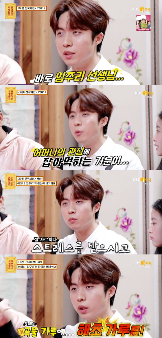 재하는 "어머니의 과도한 관심에 잡아먹히는 것 같다. 어머니 기준을 만족하지 못하면 어머니가 많이 스트레스 받는다"고 말했다. 이어 "먹는 것도 많이 간섭한다. 미숫가루에 해초 넣어서 준다"며 독특한 식사 메뉴를 밝혀 놀라움을 자아냈다.