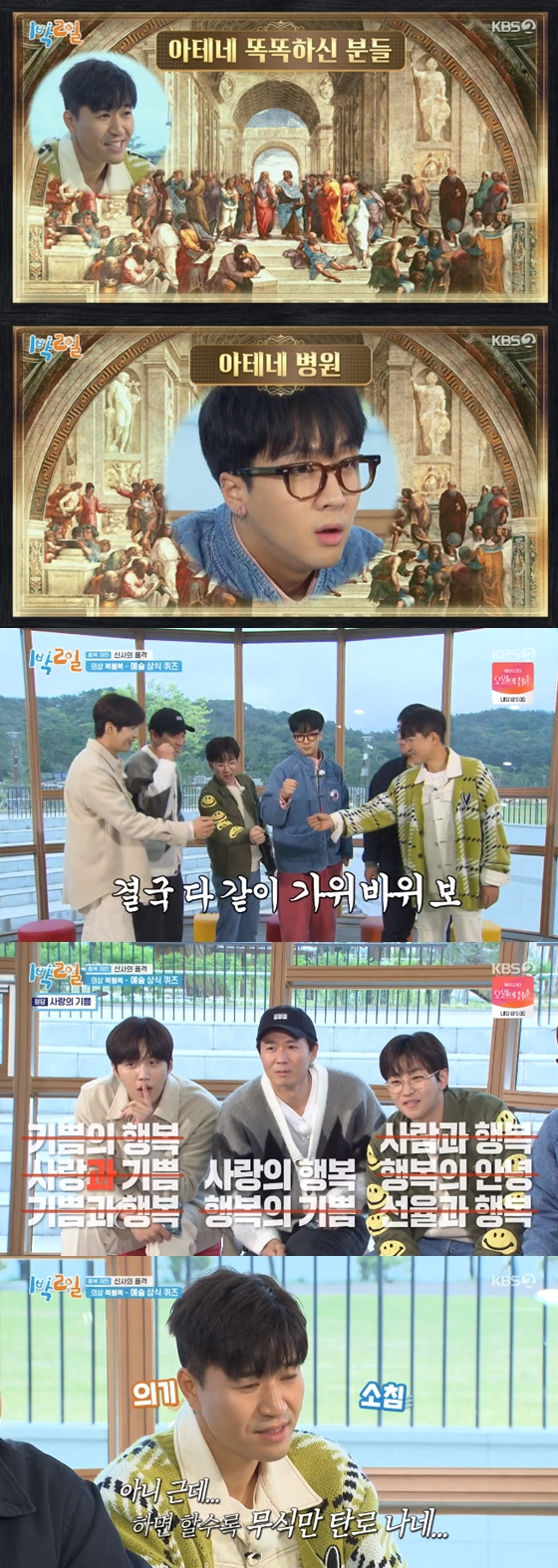 멤버들은 예술 상식 퀴즈에서 무식을 드러내며 폭소를 자아냈다. 딘딘은 '천지 창조'의 제목을 묻자 "신화 창조"라고 답했고, 이어 '아테네 학당'의 제목을 묻는 질문에 딘딘은 "안테나의 로비", 김종민 "아테네 똑똑하신 분들", 김선호는 "아테네 학교", 라비는 "아테네 병원"이라고 말해 웃음을 안겼다.