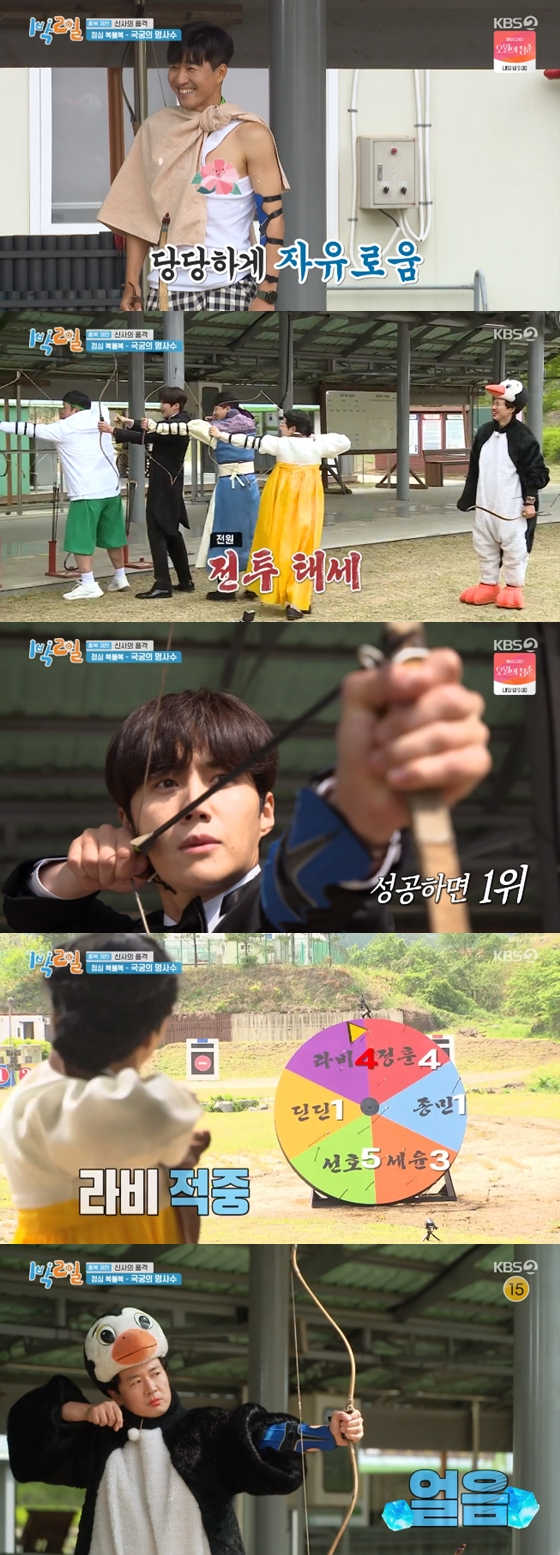1위인 김선호는 연미복을, 2위인 라비는 화랑복을 차지했다. 이어 문세윤은 테니스 선수, 딘딘은 신사임당, 연정훈은 '남극의 ㅓ신사' 펭귄, 김종민은 세신사로 변신해 폭소를 자아냈다. 멤버들이 향한 곳은 국궁 연습장이었다. 멤버들은 점심 복불복을 걸고 자신의 이름이 걸린 과녁판을 맞춰야 했다.